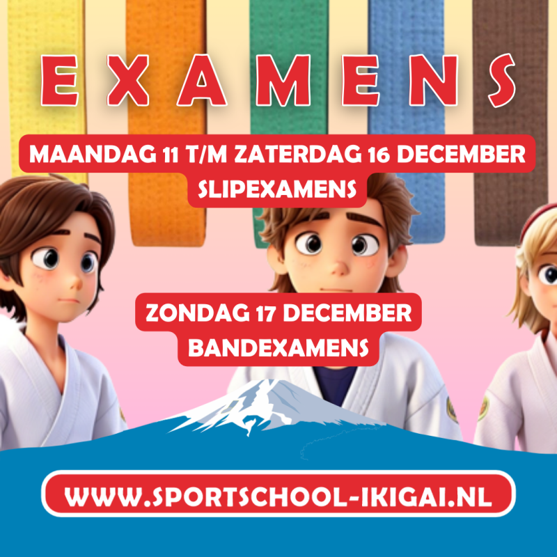 Tijdens de slipexamens (en judolessen) tot en met zaterdag 16 december blijven ouders en verzorgers bΜ²uΜ²iΜ²tΜ²eΜ²nΜ² dΜ²eΜ² zΜ²aΜ²aΜ²lΜ². Toeschouwers zijn welkom op zondag 17 december bij de bandexamens en tijdens de promotielessen tussen maandag 18 en zaterdag 23 december.