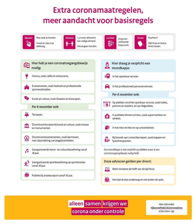 In verband met de corona maatregelen die met ingang van vandaag (zaterdag 6 november) zijn opgelegd vraag ik graag uw aandacht voor onderstaande maatregelen.
