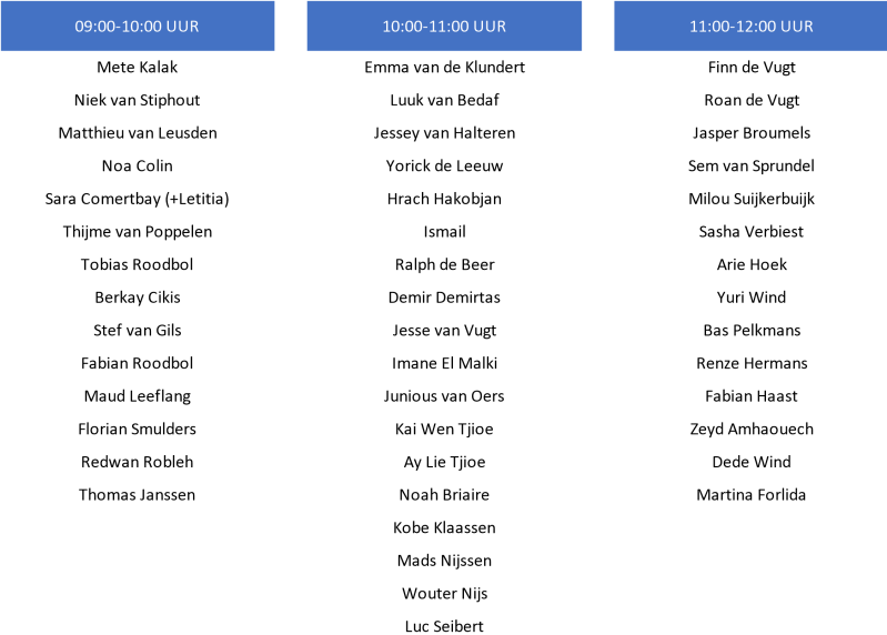 Het tijdsblok waar jij wordt verwacht zie je in onderstaand schema.